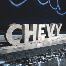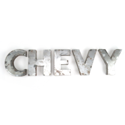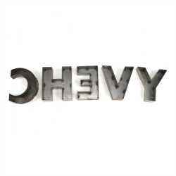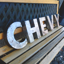 These iconic vintage 3D letters will spell out CHEVY in the style of a vintage CHEVY sign. Each set is hand made and have a patina raw metal finish giving it a cool vintage look. Can be painted to look new, or illuminated from behind for a special look. Each letter is approx. 2” (5cm) tall and when Ford is spelled out it is around 48” (100cm) long.