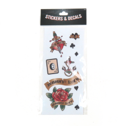 Johnny Law Motors exclusive Sailor Series Sticker Pack includes 7 sailor inspired stickers. Features cards, a rose, an anchor and a “love hurts” dagger graphic.