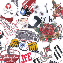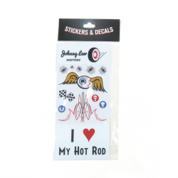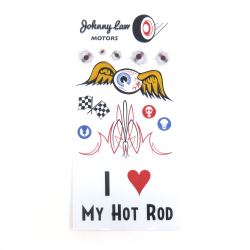 Johnny Law Motors exclusive Hot Rod Series Sticker Pack includes 13 hot rod inspired stickers. Features the Johnny Law logo, “I Heart My Hot Rod”, pinstripes and a flying eyeball, plus bonus bullet holes.