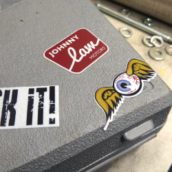 Johnny Law Motors stickers are made from heavy duty vinyl and printed with UV ink to withstand the toughest conditions. Ideal for dressing up your toolbox, bumper, or car lift! Several styles and colors available to choose from.