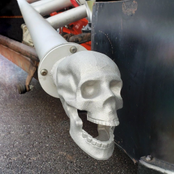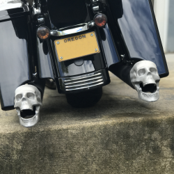 Our skull exhaust cover is bad to the bone! Great as a truck or hot rod accessory, even better on your Harley! Made from cast aluminum. Direct fit over a stock 2.5 inch automotive exhaust pipe. Will not restrict air flow. Includes mounting hardware.