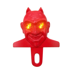 Vintages El Diablo devil license plate topper features illuminated red eyes that will light up your plate with style. Ideal for hot rod, street rods, rat rods, and customs. Made from a cast alloy metal and then hand painted to bring out the details. Can be mounted on top or bottom of the frame. Unit includes slotted mounting hole for height adjustment.