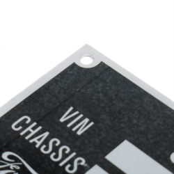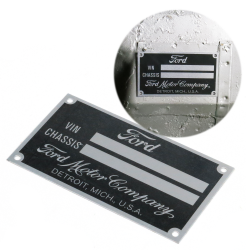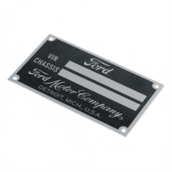 This anodized aluminum VIN plate with metallic finish is the perfect touch to any dash. Comes in black and silver with “Ford” logo. Tag your custom car, bike or boat! Let others know who is the proud owner. Personalize the blank fields to create a truly custom piece of art. This VIN name plate is 4 inches wide by 2.25 inches tall and is .5mm thick. It includes 3.5mm rivet holes in each corner for easy mounting. Fits all vehicles.