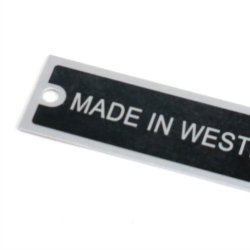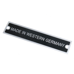 This anodized aluminum VIN plate with metallic finish is the perfect touch to any dash. Comes in black and silver and says “Made In Western Germany”. Tag your German vehicle! Let others know where your car is made. This VIN name plate is 3.5 inches wide by .75 inches tall and is .5mm thick. It includes 3.5mm rivet holes on each side for easy mounting. Fits all vehicles.