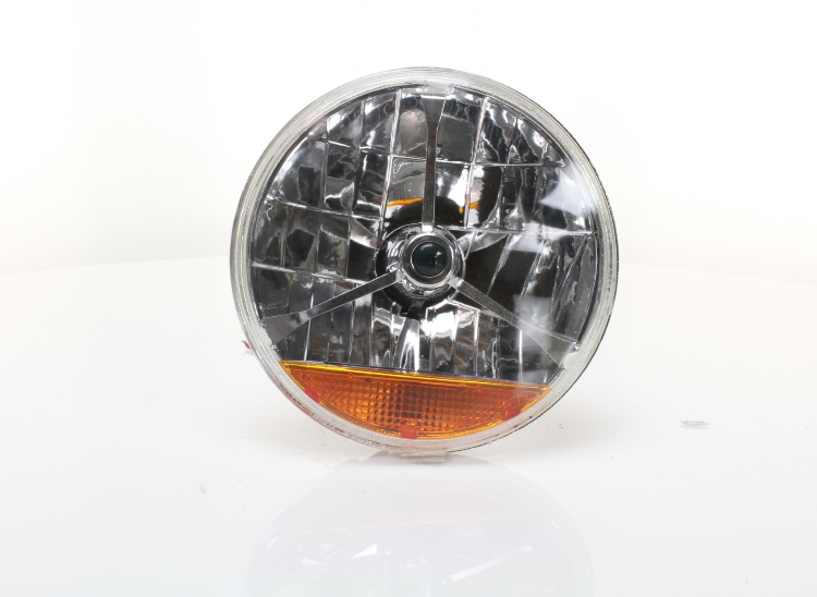 BRIGHT CHOICE! The AutoLöc Tri-Bar Headlight With turn signal and harness replaces the popular 7" sealed beam round headlights used in many cars and trucks. Uses a replaceable H4 bulb to give you the best visibility possible. Features AutoLöc's exclusive Omni-View technology to ensure maximum light output. Easy installation even for the "weekend" mechanic. The Tri-Bar Headlight is constructed of a lightweight plastic case with a glass lens. Includes removable rubber seal to prevent moisture build up and allow easy access when replacing H4 bulbs.