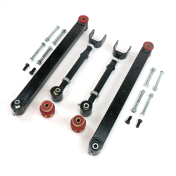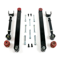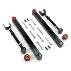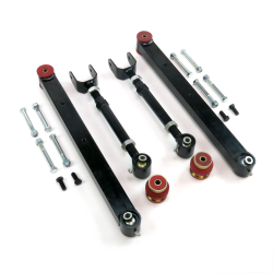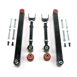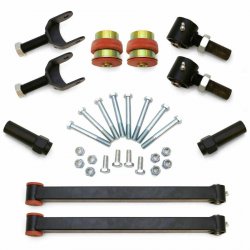 Each 4-Link kit includes custom bolt on brackets, oversized stainless steel adjusters, full upper coilover crossmember, panhard bar, 1" OD tubing oversized 4-link bars, deluxe coilover shocks, powder coated springs, axle brackets, bolt on chassis bracket, mounting hardware, and detailed instructions.